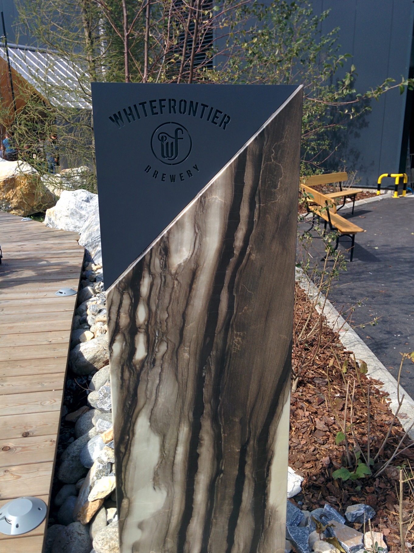 Notre concept d’aménagement des abords de la brasserie cherche à atteindre un esprit similaire et souhaite ramener l’ambiance de la montagne vers le zoning de la brasserie situé plus bas dans la vallée. La végétation, les pontons en bois, les rochers mais également l’apéro pris en bas des pistes… sont autant d’images fortes liées au paysage montagnard, gravées dans notre mémoire collective, qu’il nous importe de faire resurgir à travers l’aménagement. Parallèlement à cette recherche de résonance avec la montagne, il y a également la volonté de créer un biergarten résolument contemporain autour d’une brasserie qui est une des plus modernes et efficientes d’Europe.